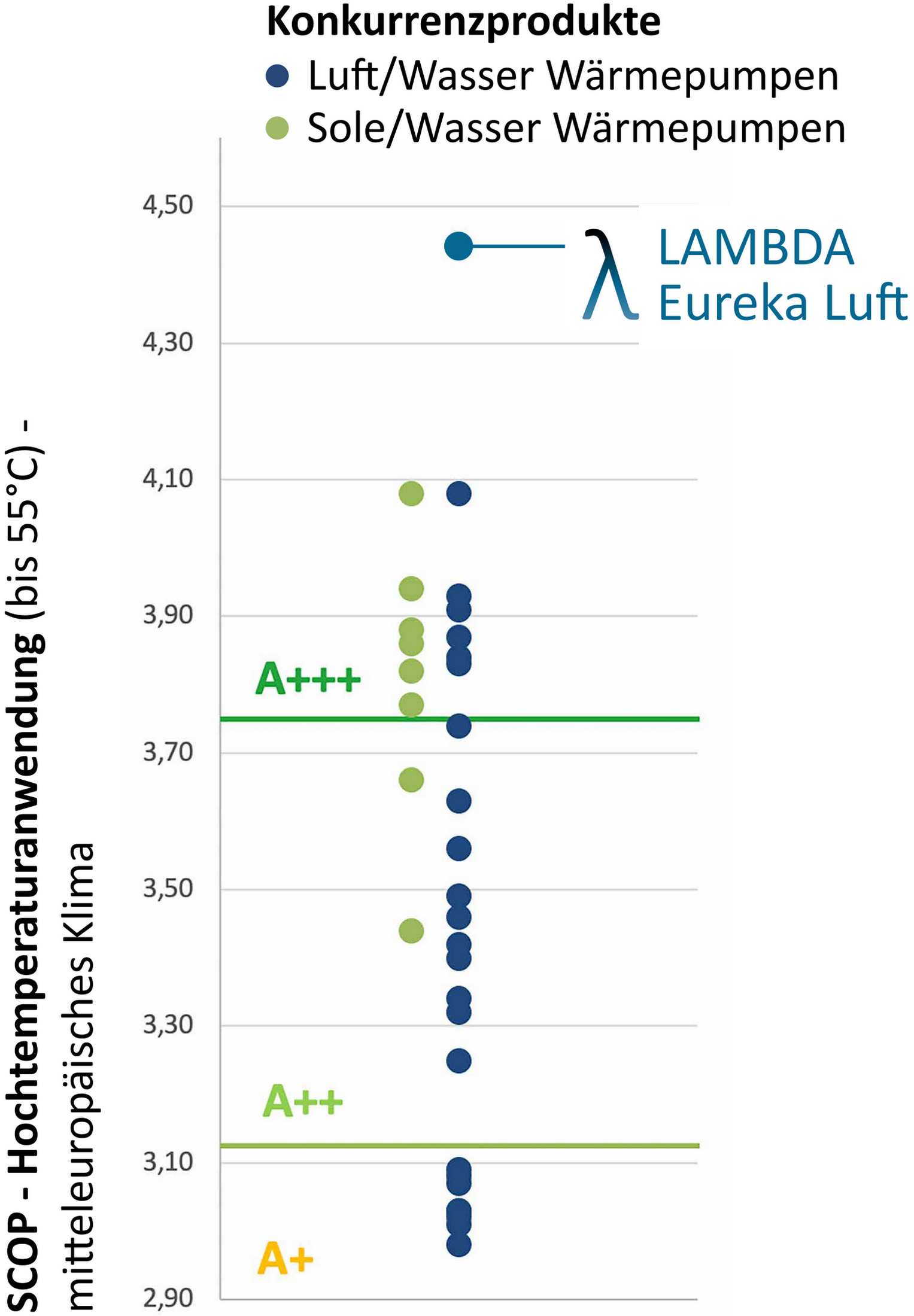Der Vergleich mit allen anderen Wärmepumpen mit offiziell bescheinigten Prüfwerten im akkreditierten Wärmepumpentestzentrum in Buchs (CH) zeigt den technologischen Vorsprung der Eureka Serie deutlich.